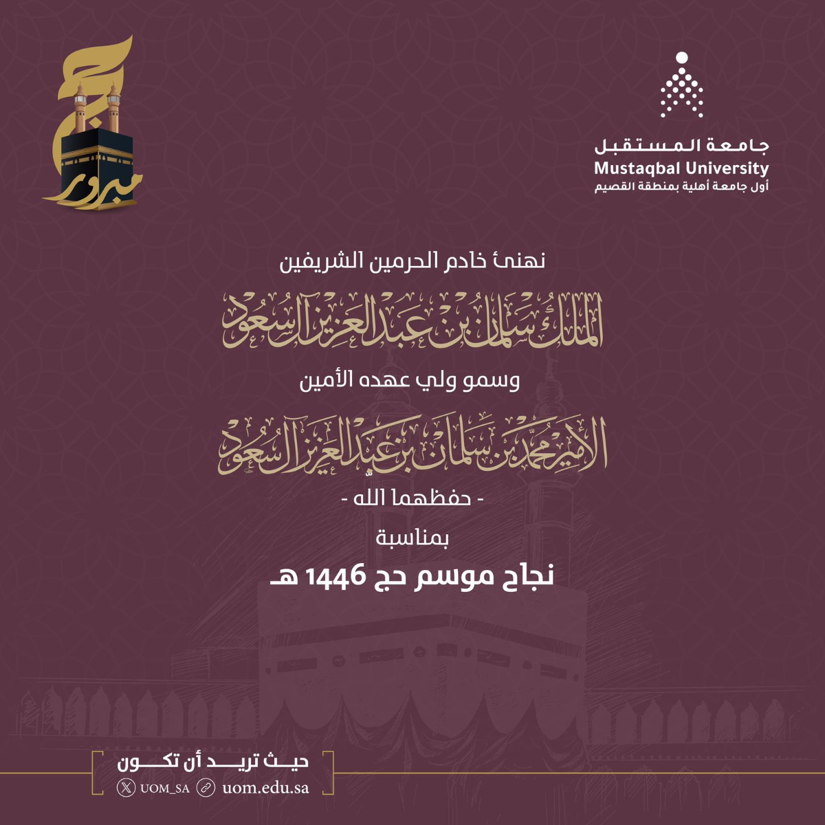 جامعة المستقبل ترفع التهنئة للقيادة الرشيدة بمناسبة نجاح موسم حج 1446هـ