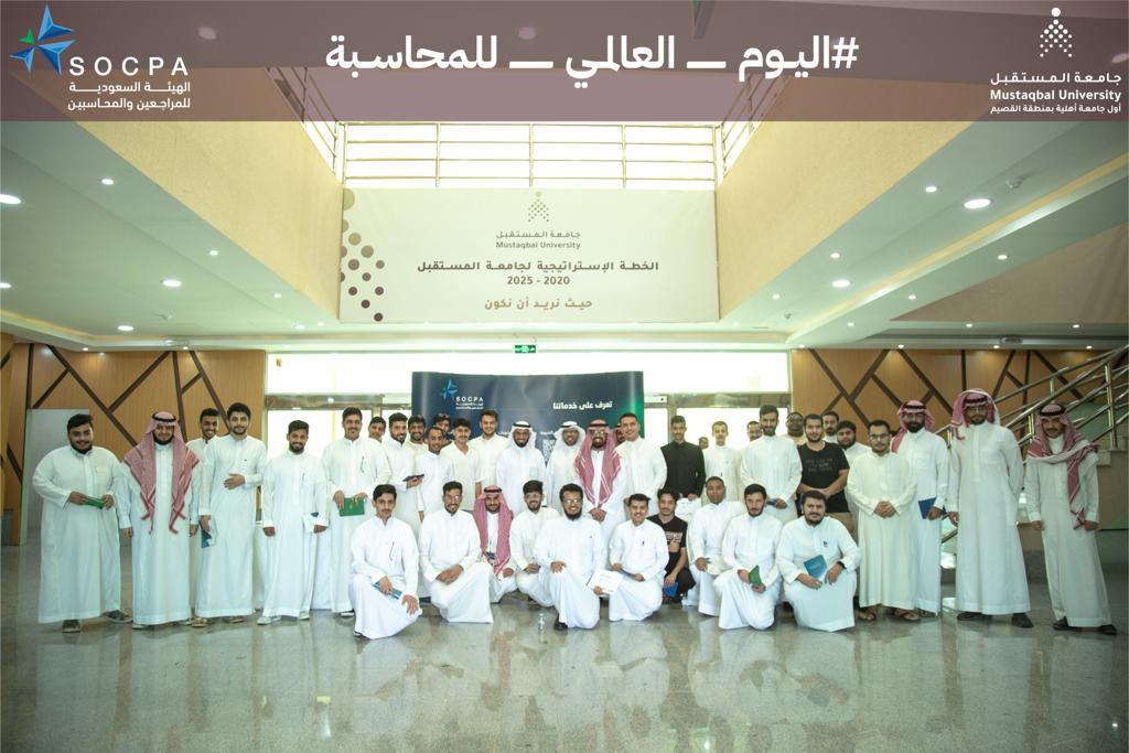 تزامنًا مع اليوم العالمي للمحاسبة، أقامت جامعة المستقبل ممثلة بكلية العلوم الإدارية والإنسانية بالتعاون مع الهيئة السعودية للمحاسبين والمراجعين عدة فعاليات وأنشطة علمية في مجال المحاسبة من خلال نادي إدارة الأعمال بالكلية بحضور 168 من طلبة الجامعة والمهتمين من المجتمع. وقد ألقى في البداية سعادة عميد الكلية الدكتور أحمد بن صالح التويجري كلمة افتتاحية رحب فيها بالحضور موضحًا فيها على أهمية التفاعل مع الأيام العالمية للمجالات العلمية، ومؤكدًا أن إقامة هذه الأنشطة تسهم في تحقيق سعي الجامعة لرفع مستوى جودة خريجيها بما يحقق لهم المنافسة في سوق العمل. بعد ذلك ألقى الأستاذ علي العثيم كلمة تحدث فيها عن الفرص الوظيفية وأحدث اتجاهات سوق العمل للمحاسبين. بعد ذلك تكلم الأستاذ رائد العتيبي عن الشهادات المهنية في مجال المحاسبة، وأهمية هذه الشهادات في تعزيز الفرص الوظيفية. وفي الختام أدار الأستاذ أسامة غالب عدة مسابقات محاسبية شارك فيها الحضور، وتم تسليم جوائز قيمة للفائزين في المراكز الثلاثة الأولى.