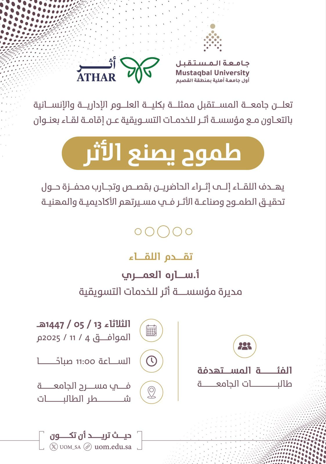 نظّمت جامعة المستقبل ممثلة بكلية العلوم الإدارية والإنسانية بالتعاون مع مؤسسة أثر للخدمات التسويقية، لقاء بعنوان: طموح يصنع الأثر، وذلك يوم الثلاثاء 13 / 5 / 1447هـ، قدّمته الأستاذة سارة العمري.