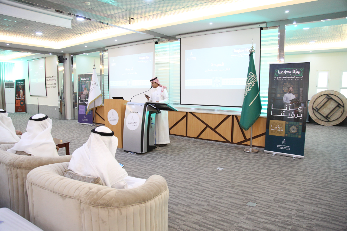 وفي ختام الحفل، ألقى سعادة رئيس الجامعة كلمة رحّب فيها بالحضور، وأكد على أهمية هذا اليوم الذي يوافق الذكرى الخامسة والتسعين لتوحيد هذه البلاد المباركة على يد المؤسس الملك عبدالعزيز – رحمه الله – الذي وحّد الصف وجمع الكلمة وأرسى بنيان هذا الوطن على الشريعة الإسلامية والعدل. وأضاف أن ما تنعم به المملكة اليوم من أمنٍ واستقرار ورخاءٍ وتلاحم بين القيادة والشعب، إنما هو ثمرة التضحيات والجهود العظيمة التي بذلت، مشددًا على واجب الجميع في الحفاظ على هذه المكتسبات والوقوف صفًا واحدًا في وجه كل فكر أو سلوك يهدد وحدة الوطن وأمنه. كما دعا إلى الإسهام الفاعل في خدمة الوطن وتحقيق مستهدفات رؤية السعودية 2030.