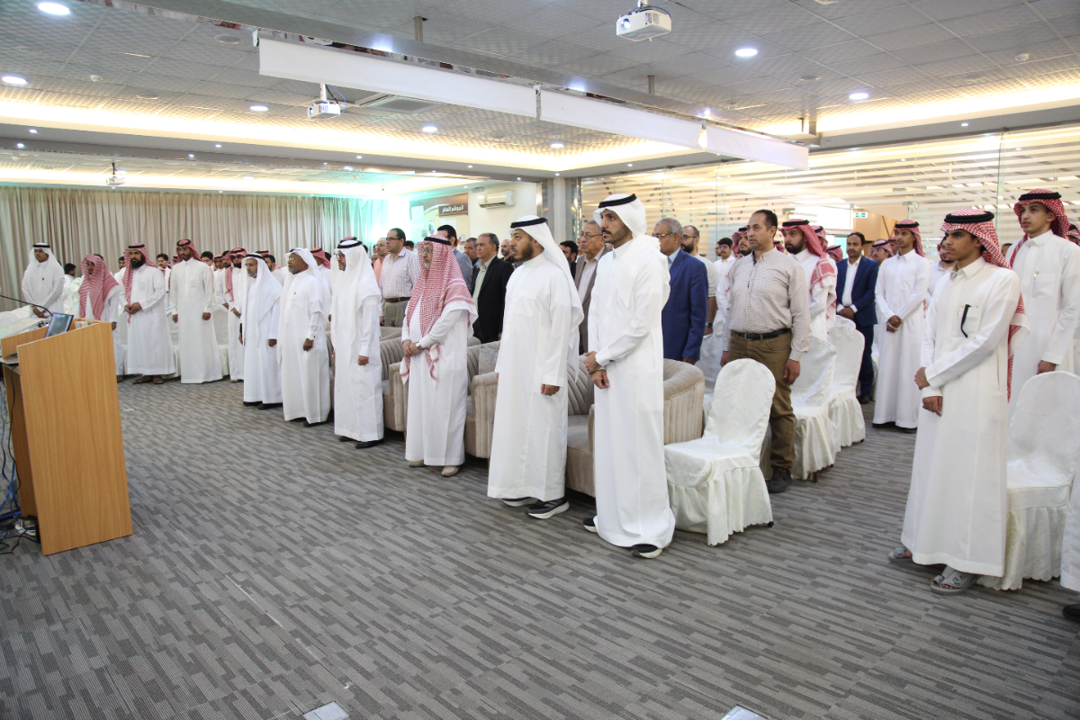 افتُتح الحفل بالسلام الملكي وتلاوة عطرة من القرآن الكريم، تلتها كلمة لسعادة مدير إدارة شؤون الطلاب والخريجين د. خالد بن إبراهيم الجعيثن، أكد فيها على معاني الانتماء والولاء للوطن وقيادته، مستعرضًا مسيرة التوحيد التي قادها المؤسس الملك عبدالعزيز بن عبدالرحمن آل سعود – طيب الله ثراه – حتى قامت المملكة العربية السعودية على أسس راسخة من العدل والتوحيد والأمن والاستقرار والعزة.